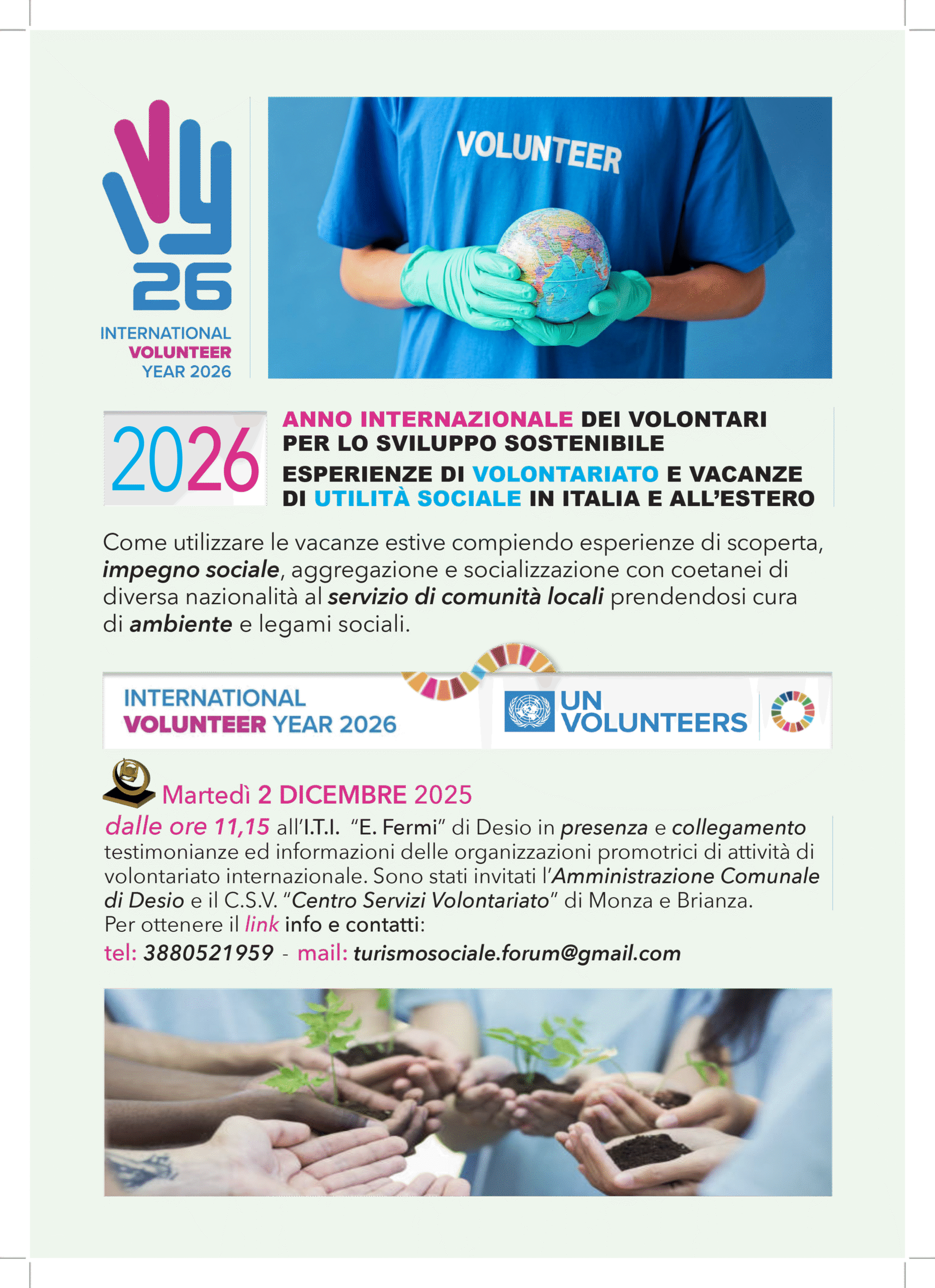 In occasione dell’approssimarsi della Giornata Internazionale del Volontariato del 5 dicembre e in considerazione che l’anno 2027 è stato proclamato dall’ONU l’Anno Internazionale del Volontariato, il 2 dicembre si terrà nell’ Auditorium ITI. “E.FERMI “di Desio la conferenza Forum Turismo Sociale: 2026 – Anno Internazionale del Volontariato dalle 11,15 alle 13,10.